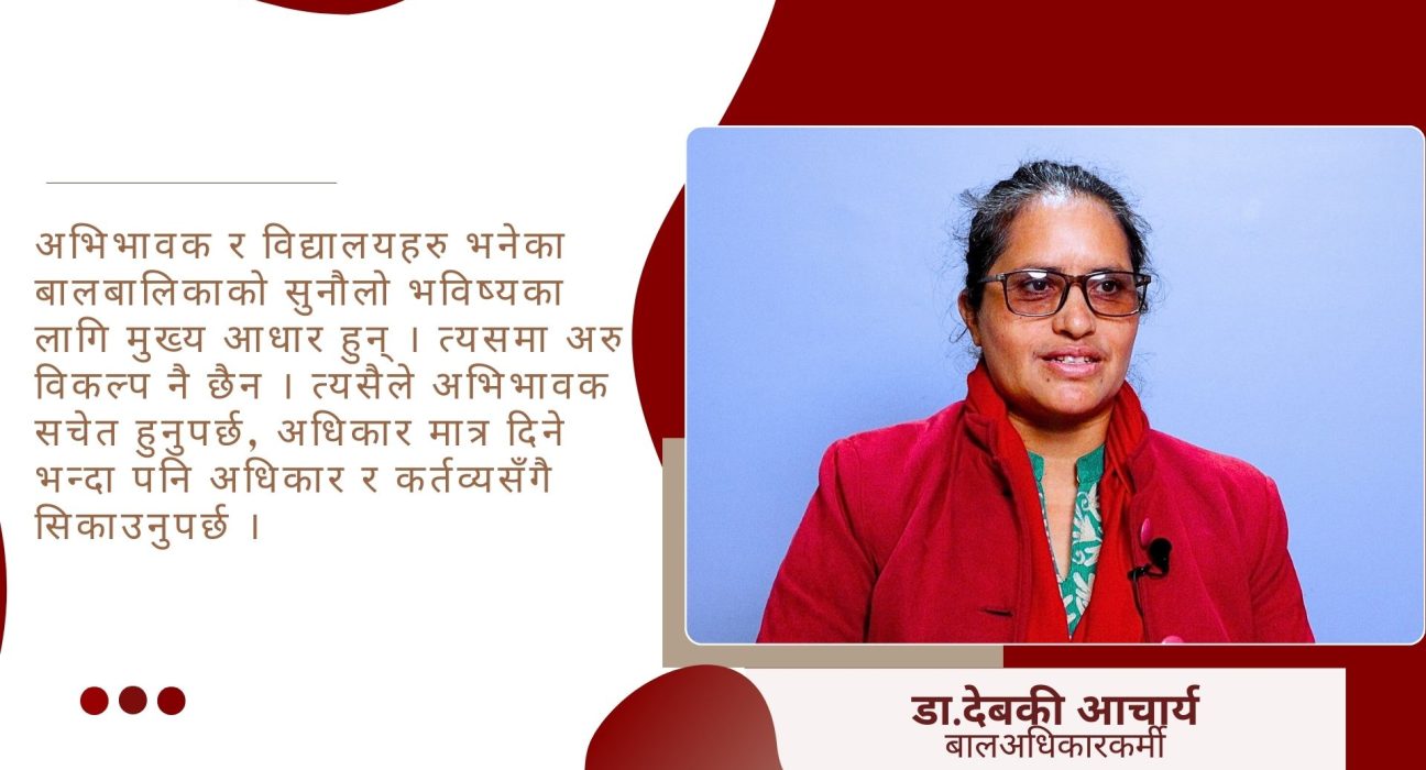 काठमाडौं । डा.देबकी आचार्य सक्रिय बाल अधिकारकर्मी हुन् । साहित्य र बालबालिकाको अधिकारका क्षेत्रमा लामो समयदेखि सक्रिय उनी स्थानीय तहमा बालबालिकाको अधिकार र नीतिगत सुधारका क्षेत्रमा पनि क्रियाशील छिन् । विश्व बाल दिवसको अवसरमा डा.आचार्यसँग कुराकानी गरेको छौं ।