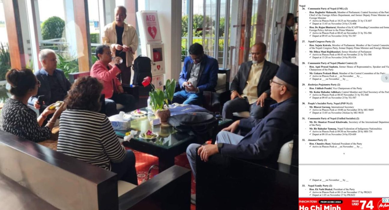 ६ मङ्सिर, काठमाडौं । नेपालमा विभिन्न राजनीतिक दलका नेताहरुको जम्बो टोली कम्बोडिया प्रस्थान गरेको छ । नेकपा एमाले, नेपाली कांग्रेस, राप्रपासहितका दलका नेताहरु बुधबार राति कम्बोडिया गएका हुन। नेताहरु कम्बोडिया गएको विषयमा नेपालमा भने चासो बढेको छ ।