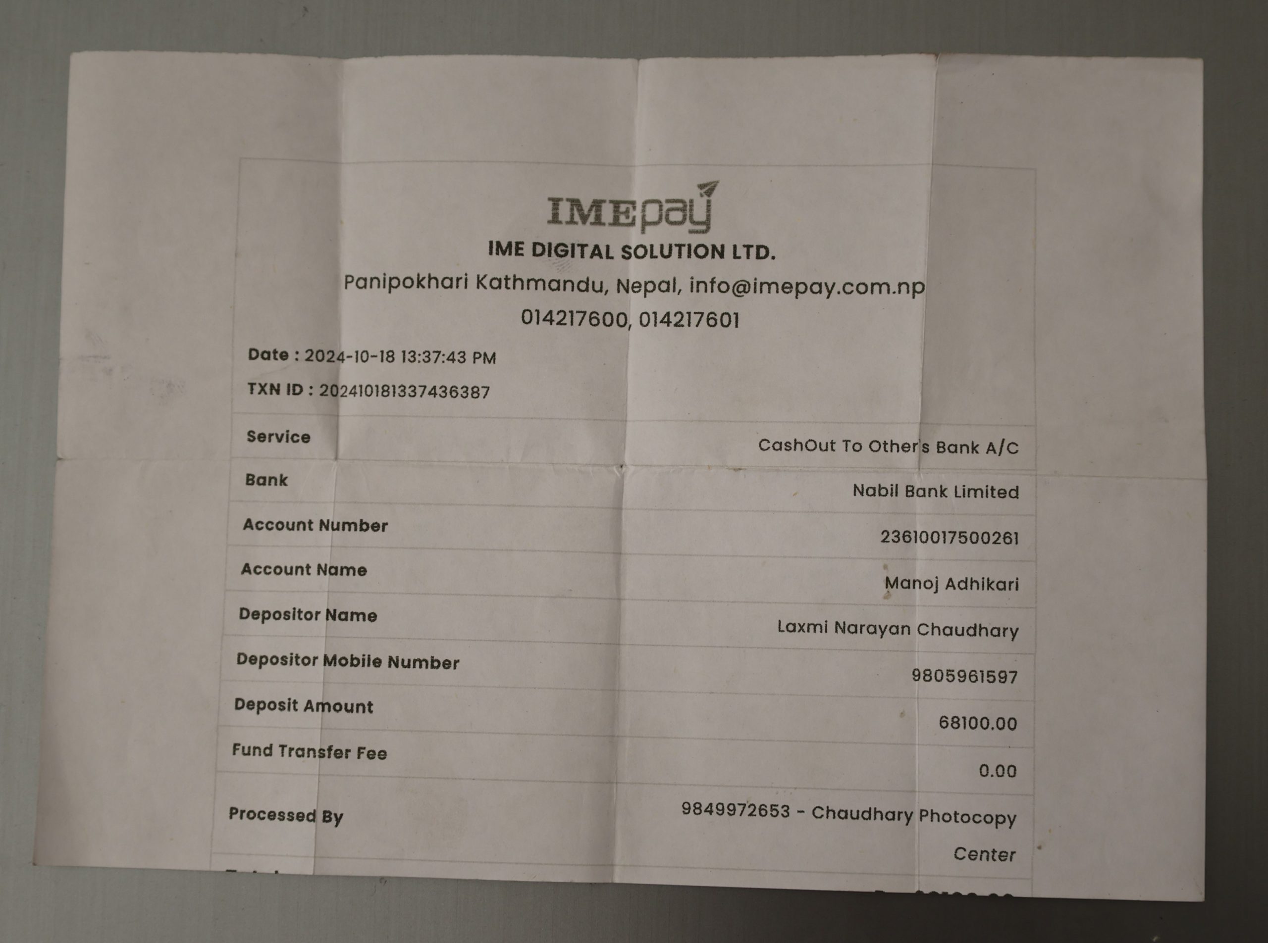 त्यो भन्दा अगाडी पिडित लक्ष्मीनारायण चौधरीले पीडक मनोज अधिकारीलाई मेडिकल र श्रमका नाममा २२,००० हजार रुपैंया लिईसकेका थिए । पछि फेरी पिडीत चौधरीले अधिकारीको नेबिल बैंकमा रहेको खाता नं.२३६१००१७५००२६१ मा ६८,१०० रुपैंया जम्मा गर्दिएका थिए ।