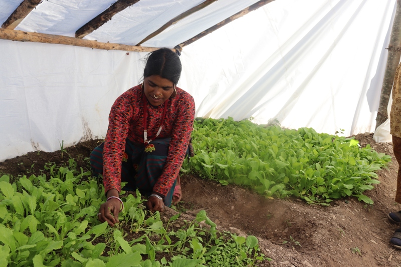 मुगुको सोरुगाँउपालिका वडा नम्बर ६ सोरुकोटका मुनदेबी कुमालले बेमौसमी तरकारी लगाएकी छन् । उनी तरकारीको रेखदेखमा नै व्यस्त देखिन्छन्। प्लास्टिक हाउस (टनेल) भित्र बेमौसमी भाजी साग,रायो,पालङ्गो साग खेती लगाउन उनी बिहानैदेखि तल्लीन हुन्छिन् ।