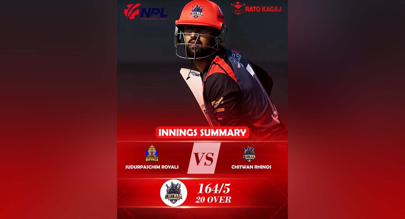 आइतवारको दोस्रो खेलमा टस जितेर ब्याटिङ रोजेको चितवनले निर्धारित २० ओभरमा ५ विकेट गुमाउँदै सुदूरपश्चिमलाई १ सय ६५ रनको योगफल दिएको हो ।
