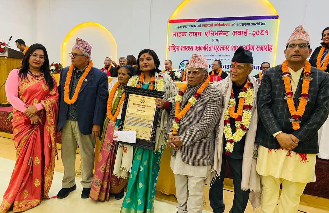 २४ मङ्सिर, गण्डकी । राष्ट्रिय समाचार समितिका पोखरा समाचारदाता जमुना वर्षा शर्मालाई राष्ट्रिय स्वास्थ्य पत्रकारिता पुरस्कारबाट सम्मानित गरिएको छ । स्वास्थ्यका क्षेत्रमा समाचार सम्प्रेषणका माध्यमबाट पु-याएको योगदानको कदर गर्दै उसलाई युआरएल फाउण्डेशनले सम्मान गरेको हो ।