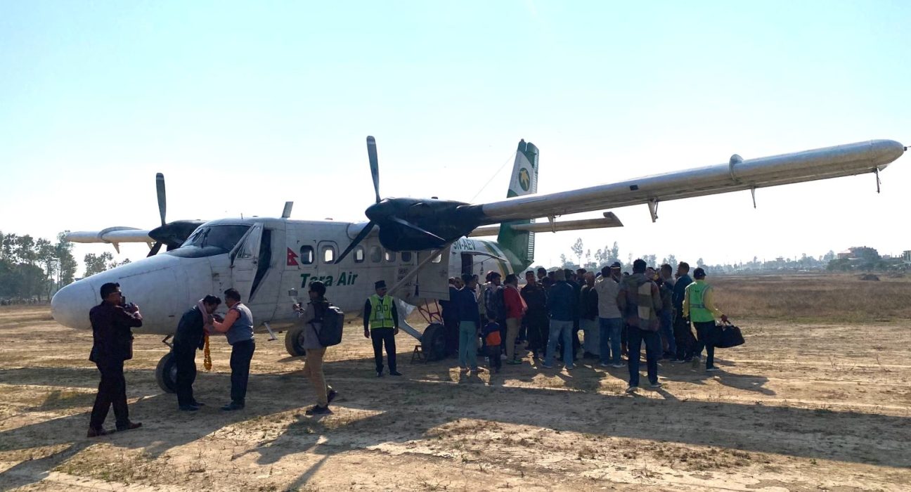 कैलाली, ३० मङ्सिर । सत्ताइस वर्र्षदेखि बन्द अवस्थामा रहेको कैलालीको टीकापुर विमानस्थल नियमित सञ्चालनमा आएको छ । आज तारा एयरको वाइटी १७०१ नम्बरको ट्वीनअटर विमानमा चालक दलका तीनसहित छ कर्मचारी र १२ यात्रु बोकेको विमान दिउँसो १ः४४ बजे टीकापुर विमानस्थलमा अवतरण गरेसँगै विमानस्थलमा नियमित हवाई उडान सुरू भएको हो ।