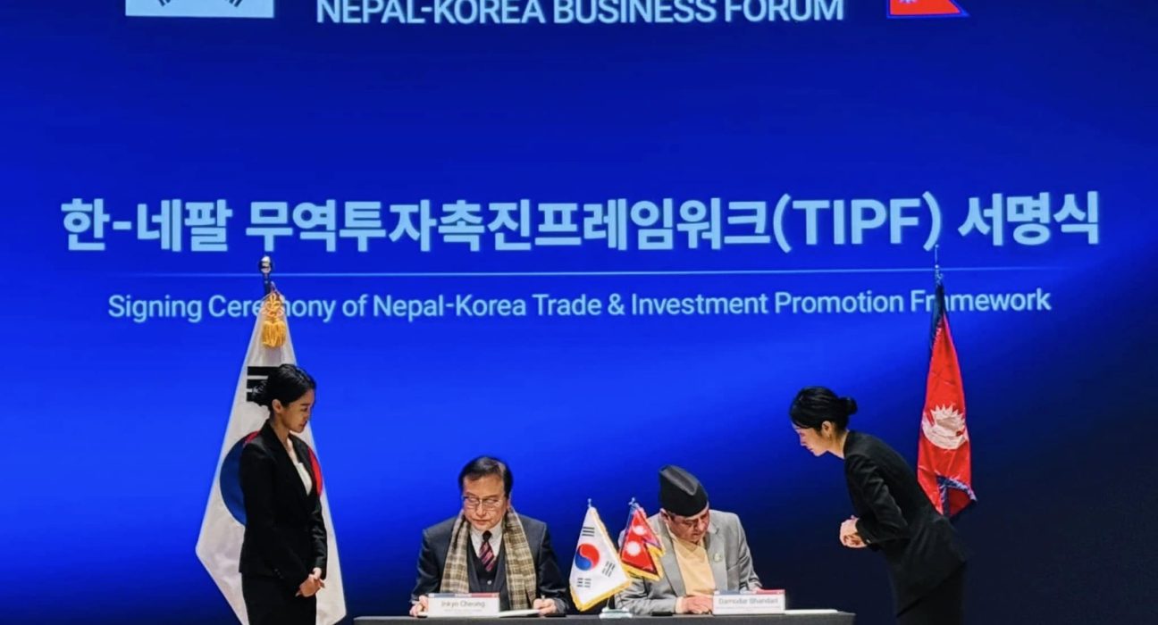 दक्षिण कोरिया । उद्योग, वाणिज्य तथा आपुर्तीमन्त्री दामोदर भण्डारी र दक्षिण कोरियाली समकक्षी इन्क्यो च्योङबीच द्विपक्षीय व्यापार तथा लगानी प्रर्वद्धन फ्रेमवर्कमा सम्झौता भएको छ ।
