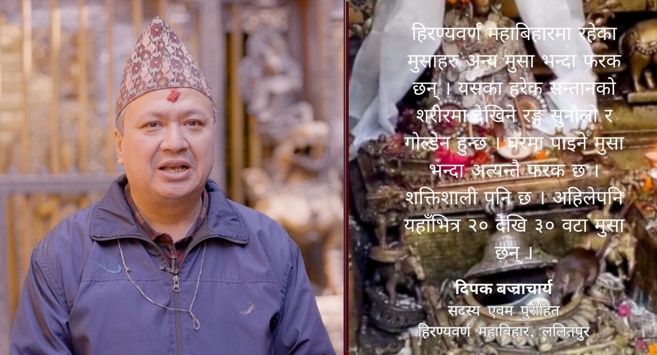 हिरण्यवर्ण महाबिहारमा रहेका मुसाहरु अन्य मुसा भन्दा फरक छन् । यसका हरेक सन्तानको शरीरमा देखिने रङ्ग सुनौलो र गोल्डेन हुन्छ । घरमा पाइने मुसा भन्दा अत्यन्तै फरक छ । शक्तिशाली पनि छ । अहिलेपनि यहाँभित्र २० देखि ३० वटा मुसा छन् ।