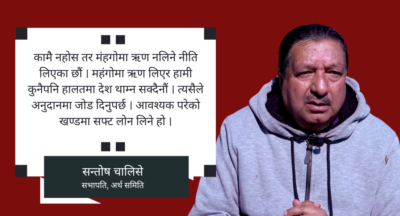 अहिलेलाई हामीले बरु कामै नहोस तर मंहगोमा ऋण चाहिँ नलिने नीति लिएका छौं । महँगोमा ऋण लिएर हामी कुनैपनि हालतमा देश थाम्न सक्दैनौं । म पहिलोपटक अर्थ समतिमा पुगेको छु । पुगेकै वर्ष चाहिने साढे चार खर्ब साँवा व्याज तिर्नुपर्ने थाहा पाए। यो ऋण भूकम्पमा देखिको हो । त्यसैले अनुदानमा जोड दिनुपर्छ । आवश्यक परेको खण्डमा सफ्ट लोन लिने हो ।