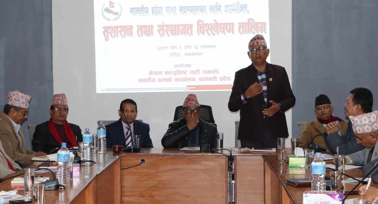 एमाले बागमती प्रदेश संसदीय दलले आज यहाँ आयोजना गरेको प्रशिक्षणमा सुशासन कायम गर्दै जनताका चाहना पूरा गर्नेतर्फ सरकार लागेको बताए । उनले आर्थिक समृद्धि र सुशासनलाई वर्तमान सरकारले प्राथमिकतामा राखेर काम गरिरहेको र पार्टीले पनि त्यसमा निरन्तर सहयोग गर्दै आएको बताए ।