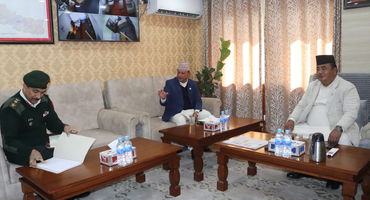 दुई मन्त्रीको भेटमा रक्षामन्त्री राईले पूर्वको किमाथाङ्का नाका, पश्चिमको हिल्सा नाका र केरुङ नाकालाई सरकारले प्राथमिकतामा राखेको जानकारी गराए । भेटमा नेपाली सेनाका महासेनानी धर्मेन्द्रकुमार झाले खाँदबारी–किमाथाङ्का सडकखण्डको अतिविकट खण्डमा ट्र्याक खोल्ने कार्य अन्तिम चरणमा पुगेको बताए ।