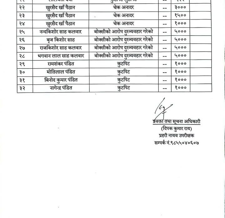 उनीहरूबाट जरिबाना स्वरूप करीब ६५ हजार रुपैयाँ र ६ महिना कैद असुल गरिनुपर्ने देखिएको जिल्ला प्रहरी कार्यालय रौतहटको सूचनामा उल्लेख गरिएको छ।