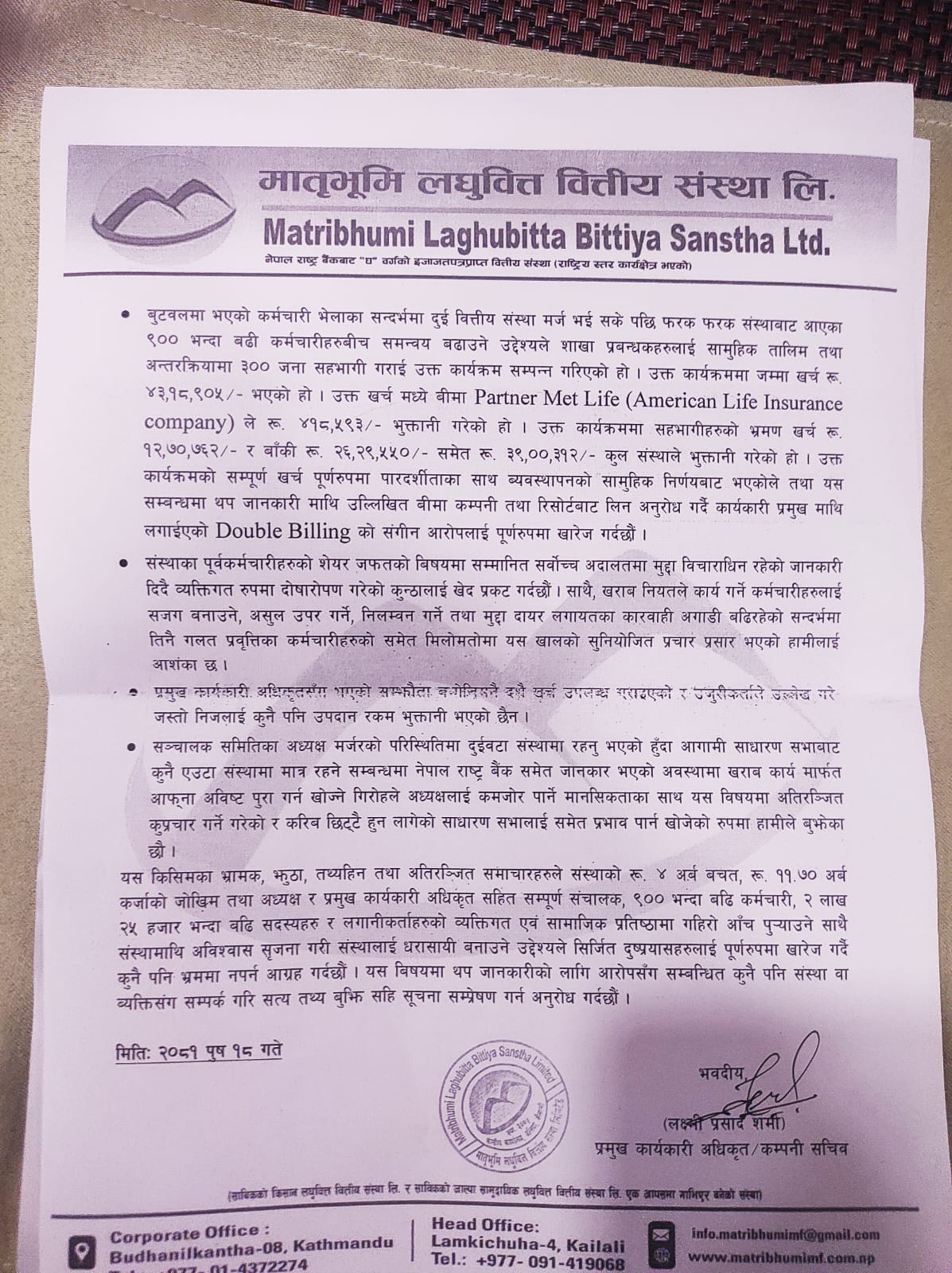 अध्यक्ष र सीइओविरुद्ध लगाइएका आरोप असत्य र निराधार भएको मातृभूमि लघुवित्त वित्तीय संस्थाको खण्डन