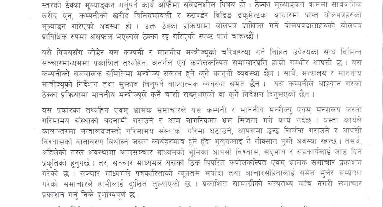 कम्पनीले यस्ता प्रकारका तथ्यहिन एवम् भ्रामक समाचारले यस कम्पनी र माननीय मन्त्रीज्यू एवम् मन्त्रालय जस्तो गरिमामय संस्थाको बदनामी गराउने र आम नागरिकमा भ्रम सिर्जना गर्ने कार्य गर्ने र कालान्तरमा मन्त्रालयजस्तो गरिमामय संस्थाको गरिमा घटाउने, आपसमा द्धन्द्ध सिर्जना गराउने र आपसी विश्वासको वातावरण विथोल्ने जस्ता कार्यहरुमात्र हुने हुँदा मुलुकलाई नै नोक्सान पुग्ने अवस्था रहने बताएको छ ।