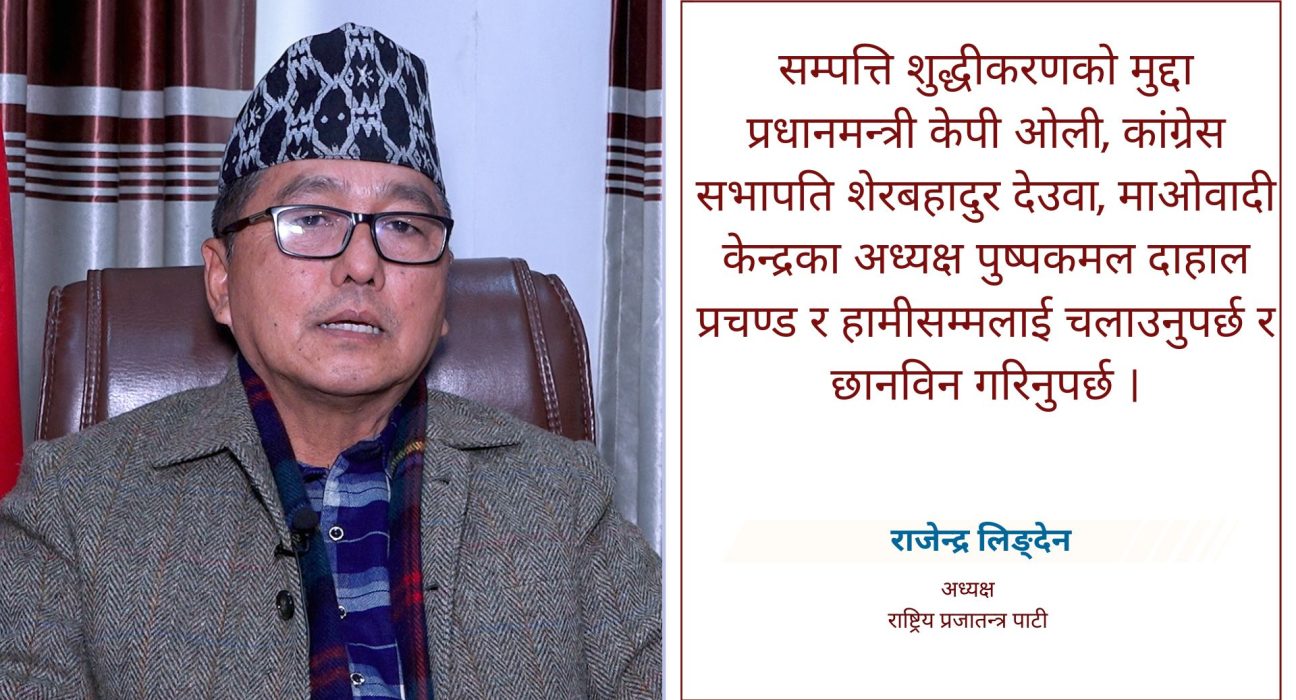 राजेन्द्र लिङ्देन राष्ट्रिय प्रजातन्त्र पार्टीका अध्यक्ष हुन् । भ्रष्टाचारमा संलग्न उच्च राजनीतिक नेतृत्वलाई छानबिन गर्न माग गर्दै देशका विभिन्न स्थानमा भएका सभाहरुलाई सम्बोधन गरेर काठमाडौं फर्किएका उनी हाल ३०३ औं पृथ्वी जयन्ती तथा राष्ट्रिय एकता दिवस मनाउने तयारीमा छन् । राजतन्त्र पुनर्वाहली, हिन्दू राष्ट्र पुनस्र्थापनालगायतका माग राख्दै आएको आएको राप्रपाका आगामी योजना, प्रतिपक्षीको भूमिका, सरकारको समीक्षा र सांगठनिक गतिविधिलगायतका विषयमा नेपाल न्यूज बैंकले अध्यक्ष लिङदेनसँग कुराकानी गरेको छ