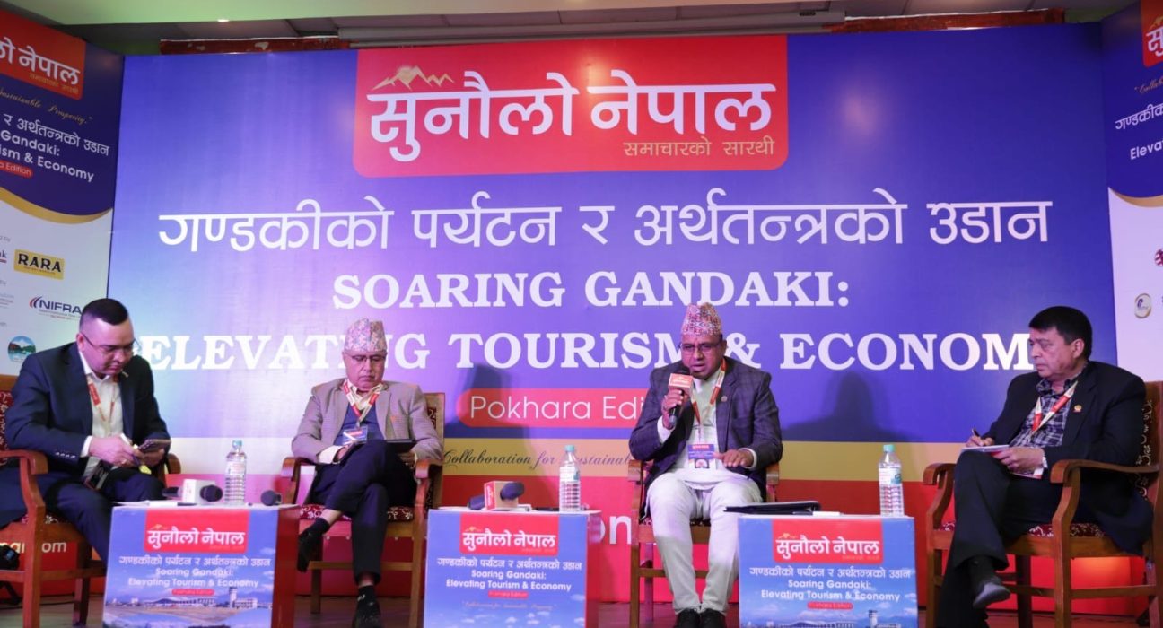 ‘सुनौलो नेपाल अनलाइन प्राइभेट लिमिटेड’द्वारा आज पोखरामा आयोजित ‘गण्डकीको पर्यटन र अर्थतन्त्रको उडान’ विषयक अन्तरसंवाद कार्यक्रममा उनले राष्ट्रिय ध्वजाबहाक हिमालयन एयरलाइन्सले पोखरा–ल्वासा उडानको तयारी गरिरहेको बताए ।