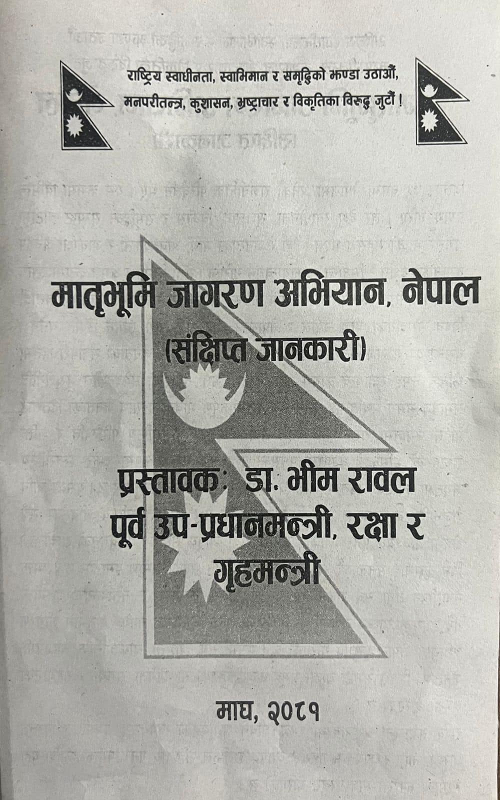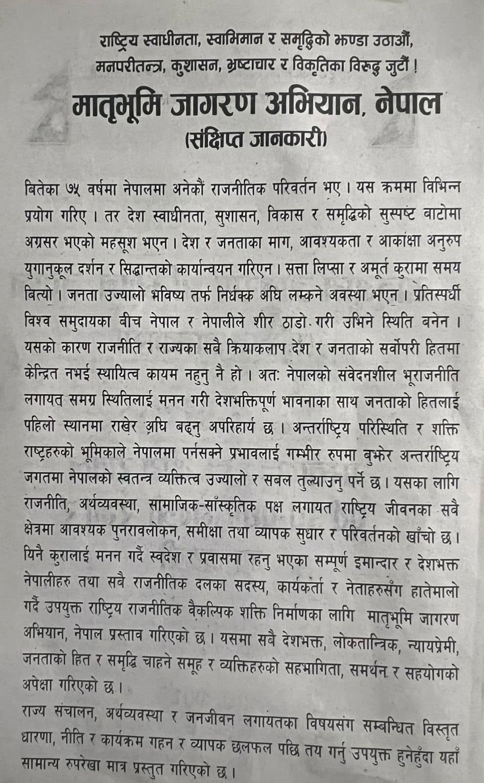 सार्वजनिक अवधारणापत्र अनुसार उनको पार्टीको नाम ‘मातृभूमि जागरण अभियान, नेपाल’ रहनेछ ।