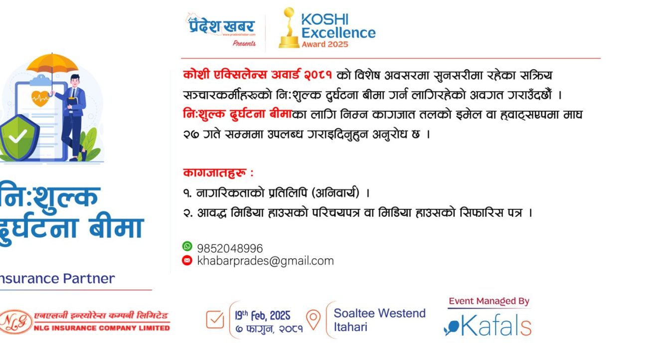 यसै अवसरमा प्रदेश खबर डट कमले फागुन ७ गते ‘कोशी एक्सिलेन्स अवार्ड २०८१’ कार्यक्रम आयोजना गर्ने तयारी गरिरहेको छ। सो अवसरमा विभिन्न क्षेत्रका उत्कृष्ट व्यक्तित्वहरूलाई सम्मान गरिने बताइएको छ।