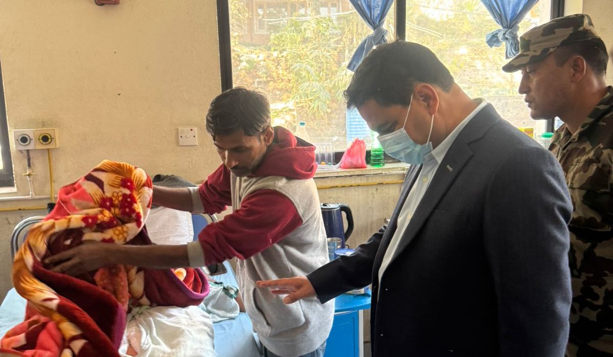 काठमाडौं २८ कमलपोखरीस्थित एक मःमः आउटलेट आगलागीका क्रममा जलेर घाइते बिरामीहरुको उपचार अवस्थाबारे जानकारी लिंदै मन्त्री पौडेलले बिरामीहरुका गुनासा सुने ।