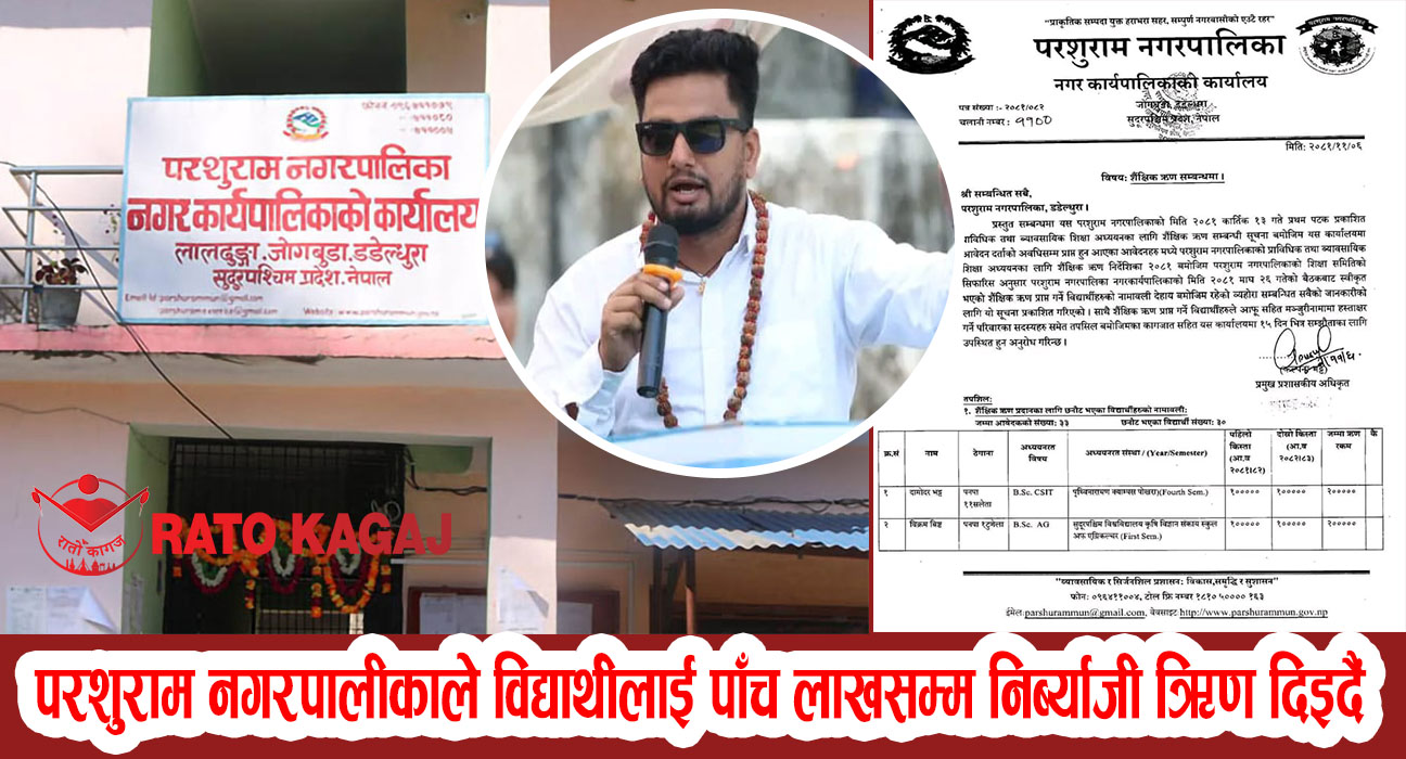‘दूरदराज र ग्रामीण भेगका आयस्तर कम भएका मेधावी विद्यार्थीलाई स्वदेशमै प्राविधिक तथा व्यावसायिक शिक्षाको अवसर प्रदान गर्ने उदेश्यले शैक्षिक ऋण प्रदान गर्न थालेको नगरपालीकाले जनाएको छ । पैसाकै कारण पढ्ने सपनालाई मर्न नदिन बिनाब्याज ऋण दिएर प्राविधिक विषयमा पहुँच बढाउन खोजेको परशुराम नगरपालिकाका प्रमुख भरत बडायरले जानकारी दिए ।