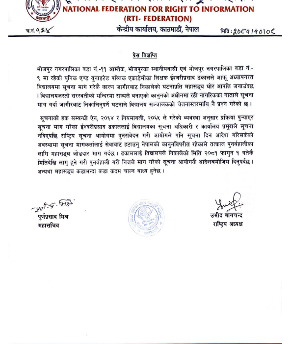भोजपुर नगरपालिका वडा नं.११ आम्तेकका स्थानीयवासी एवं भोजपुर नगरपालिका वडा नं.९ मा रहेको युनिक एण्ड युनाइटेड पब्लिक एकेडेमीका शिक्षक ईश्वरीप्रसाद ढकालले आफू अध्यापनरत विद्यालयमा सूचना माग गरेकै कारण जागीरबाट निकालेको घटनाप्रति महासङ्घको आपत्ति जनाएको हो ।