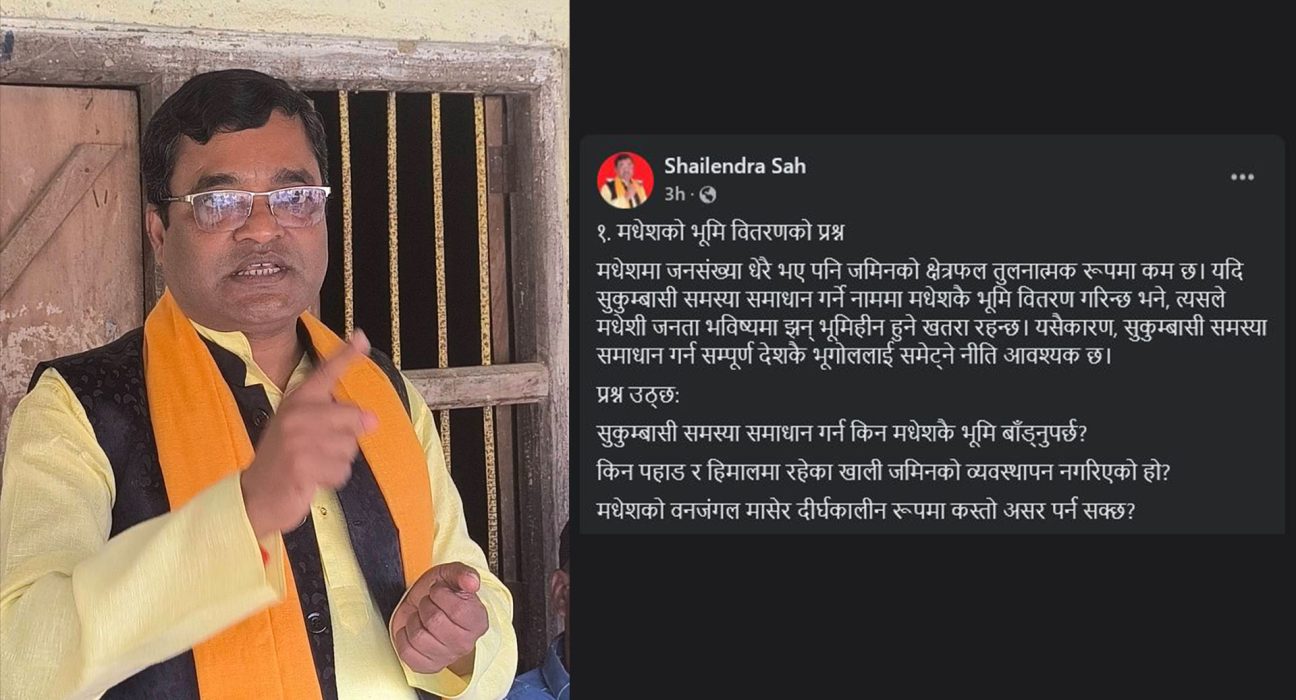 समाजिक संजालमा सरकारमाथि प्रश्न तेस्र्याउँदै सचिव साहले लेखेका छन् ,‘सुकुम्बासी समस्या समाधान गर्न मधेशकै भूमि बाड्नुपर्छ ?’