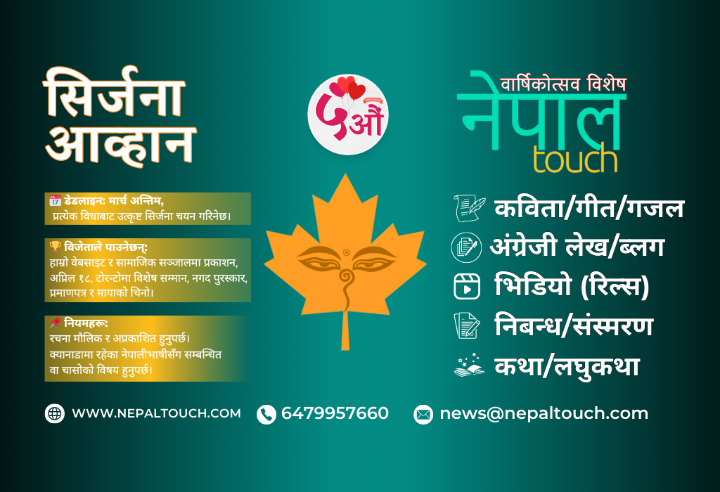 सुरुबाटै नेपाली भाषी स्रष्टा र सर्जकलाई स्थान दिँदै आएको ‘नेपाल टच’ले पाँचौं वार्षिकोत्सव अवसरमा खुला प्रतिस्पर्धा नै आह्वान गरेको छ। कविता, निबन्ध, कथा, भिडियो र अंङ्ग्रेजी लेख गरी पाँच विधामा क्यानाडाका नेपाली भाषीबाट रचना मागिएको छ।