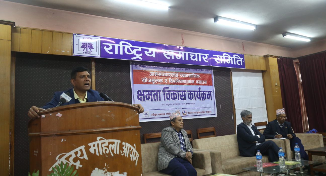 १८ फागुन, काठमाडौँ । आमसञ्चारलाई व्यावसायिक, खोजमूलक र विश्लेषणत्मक बनाउने उद्देश्यले सार्वजनिक सञ्चारमाध्यममा क्रियाशील पत्रकारका लागि एक दिवसीय क्षमता विकास कार्यक्रम आयोजना गरिएको छ । सञ्चार तथा सूचना प्रविधि मन्त्रालयको आयोजना र राष्ट्रिय समाचार समिति (रासस)को व्यवस्थापनमा आयोजित क्षमता विकास कार्यक्रममा सार्वजनिक सञ्चारमाध्यमका करिब ४० जना पत्रकारको सहभागिता रहेको छ ।