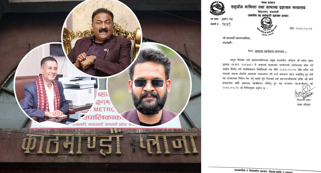 मन्त्रालयको स्थानीय तह कर्मचारी प्रशासन शाखाले काठमाडौं महानगरलाई बुधबार पत्राचार गर्दै भनेको छ, ‘प्रस्तुत विषयमा तहाँ महानगरपालिकाका प्रमुख प्रशासकीय अधिकृत श्री सरोज प्रसाद गुरागाईंले आफूलाई खटाइएको कार्यालयको कार्यकक्षमा प्रवेश गर्न अवरोध सिर्जना गरी कार्यवातावरण विथोलिएको तथा मिति २०८१÷०९÷०८ देखि हाजिर गर्न नपाएको अवस्था रहेकोले आवश्यक व्यवस्थापन गरी कार्य वातावरण सहज बनाइदिनु हुन भनी यस मन्त्रालयमा निवेदन पेश गर्नुभएको हुँदा निजलाई तहाँ महानगरपालिकामा हाजिर भई कार्य सम्पादनका लागि आवश्यक सहजीकरण गरिदिनु हुन यस मन्त्रालय (मा. मन्त्रीस्तर) को २०८१÷११÷२१ को निर्णयानुसार अनुरोध छ ।’