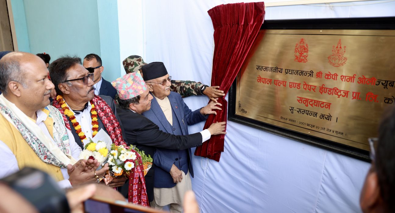 महोत्तरी, २२ फागुन । प्रधानमन्त्री केपी शर्मा ओलीले ‘नेपाल पल्प एण्ड पेपर इण्डष्ट्रिज’को आज उद्घाटन गरेका छन् ।