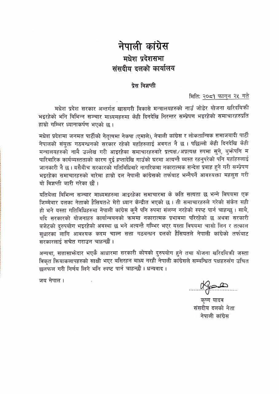 आइतबार जारी विज्ञप्तिमा नेता यादवले योजना खरिद–बिक्री जस्ता विकृत गतिविधिहरूमा पार्टीको कुनै संलग्नता नरहेको स्पष्ट पार्दै, यस्तो गतिविधिको साक्षी भएर बसिरहन कांग्रेस बाध्य नहुने उल्लेख गरेका छन्। उनले आवश्यक छलफल गरी उचित निर्णय लिने कांग्रेसको प्रतिबद्धता दोहो¥याएका छन्।