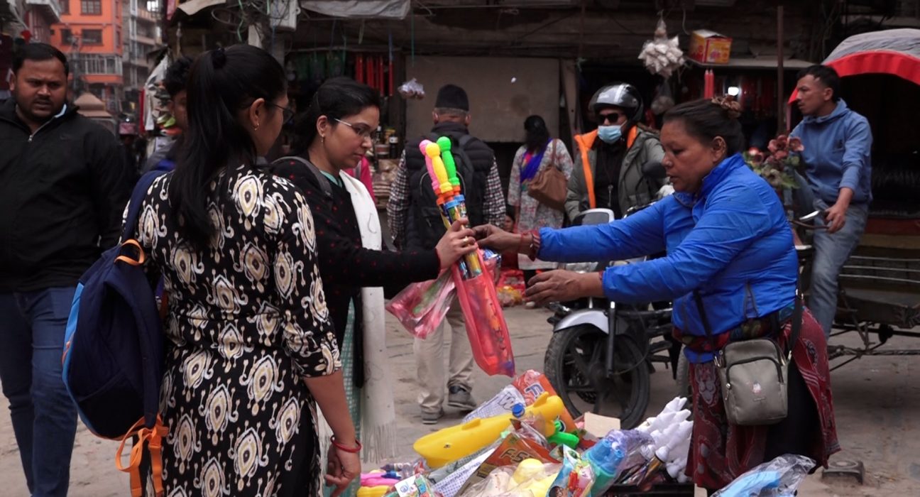 तथापि, नेपाली उत्पादनको बिक्रीमा केही आशा देखिएको छ । यसैगरी अर्का असनकै व्यापारी रामु कुमार भन्छन्, ‘व्यापार घट्दै गएको छ । होलीका लुगाहरू पहिला जस्तो बेचिएका छैनन् । यसले एक प्रकारको चिन्ता व्यक्त गरेको छ ।’