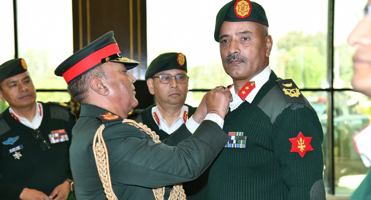 काठमडौँ, ६ चैत । प्रधान सेनापति अशोकराज सिग्देलले आज जङ्गीअड्डामा आयोजित एक कार्यक्रममा उपरथीमा विशेष पदोन्नति भएका सहायक रथी रामप्रसाद अधिकारीलाई उपरथीको दर्ज्यानी चिह्न प्रदान गरेका छन् ।
