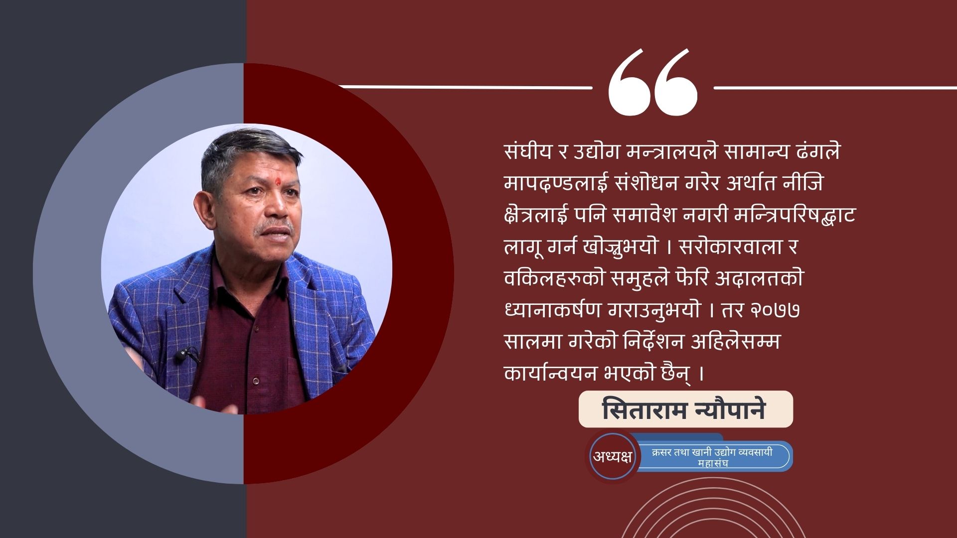 गृहमन्त्री रवि लामिछाने हुँदा देशभरीमा दर्ता भएका उद्योग ७ सय ८० मध्ये ०७७ को मापदण्डकै कारण दुईतीन सय उद्योग विस्तापित भए । यतिबेला चारपाँच सय उद्योग छौं । नविकरण गरिदिनुहोस भन्दा उहाँहरुले एकाएक वैध र अवैध भन्ने कुरा उठाउनुभयो । देशभरीका उद्योग बन्द गर्नुभयो । हामीले त्यहीबेला गृह मन्त्रालयमा के ध्यानाकर्षण गरेका थियौं भने तपाईहरुको उद्देश्य के हो, हामी तड्पी तडपी मर्ने अवस्थामा छौं भनेका थियौं । यस्ता उद्योगहरु चाहिदैन भने बन्द गरौं, चाहिन्छ भने विधि बनाएर संचालन गरौं भनेका हौं । उहाँहरुले वैध र अवैधको विवरण अध्ययन गर्न खोजेका हौं भनेपछि सघाउँछौं भनेर जिल्लामा रहेका संयन्त्रलाई दुवैतर्फबाट पत्रचार गर्ने भनेर सहयात्रीको रुपमा हामीले काम गरेका थियौं । एक महिनापछि गृह मन्त्रालयले के जारी गर्यो भने नेपालका सबै जिल्लामा १२ सय ८३ उद्योग सञ्चालनमा छन भन्ने डाटा आयो । उहाँहरुको डाटा अनुसार चाहीं सातआठ सय उद्योगहरु चाँही कानुनविपरीत चलेका रहेछन् । विधिको शासन सञ्चालन गर्ने हो भने जिम्मेवारी बोकेको विभागीय मन्त्रालयले कानुन सम्मत दर्ता भएका उद्योगको नविकरण गर्नुहोस् र कानुनको दायरामा आउनुपर्नेलाई दायरामा ल्याउनुहोस भनेका हौं । उद्योगहरु पनि बिना अनुमति त मानिसले लगानी गरेको छैन । तर कानुनी प्रकृया पूरा भइसकेको छैन भने प्रकृयामा ल्याउनुहोस भनेका हौं । यसका लागि सरकारी र नीजि तह एक ठाउँमा बसौं भनेका हौं । यसरी काम गर्दा कानुनको दायराभन्दा बाहिर रहेका उद्योगलाई पनि ल्याउन सक्छौं । अदालतले निर्देशन गरेको ऐन लागू गरेर दिगो व्यवस्थापनमा लागौं भनेर सरकारको तहमा ध्यानाकर्षण गरेका छौं । यतिबेला यो एकदमै गम्भीर विषय भइसक्यो । सरकारको तहमा बुझाउन पनि हामीले कमी राखेको छैनौं । सरकारी तहमा रहेको कर्मचारीहरुपनि बुझ्न तयार हुनुहुन्न र मन्त्रीज्यूहरु पनि बुझ्न तयार हुनुहुन्न । हामीसँग बसेर छलफल नै गर्न चाहनुहुन्न । विद्यमान कानुन अनुसार दर्ता भएको उद्यागेहरु एकातिर छन् । कानुनविपरित भनेर अर्कातिर राख्नुभएको छ । कानुनसम्मत भएकालाई पनि अवैध भनेर मापदण्ड लगाएर राख्नुभएको छ । मापदण्ड ठिक छ भने कि लागू गरेर जानुपर्यो, होइन भने संशोधन गर्नुपर्यो । यो तीन तहको सरकारले नै महशुस गरिसकेको छ । मापदण्ड चन्द्रमामा बाहेक अन्त लागू हुँदैन । नेपालको भूगोलले यसलाई समेट्दैन । हिजो सहजता थियो त्यो सहजतालाई समस्या बनाइयो । स्वार्थ समूहले फाइदा लिइरहेको छ । हामीलाई दुई मन्त्रालयसँग एकदमै ठूलो गुनासो छ । मन्त्रिपरिषद्ले निर्णय गर्दा समेत लागू नगर्ने यो मापदण्ड पालेर राख्दा फाइदा छ भन्ने सोचाइ भएको छ ।
