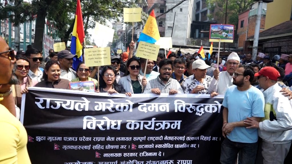 राप्रपा र निकटका संगठनले नेताहरूलाई झूटो मुद्दा लगाएर पक्राउ गरी कारवाही थालिएको भन्दै रिहाइको मागसहित विरोध प्रदर्शन गरेका हुन् ।