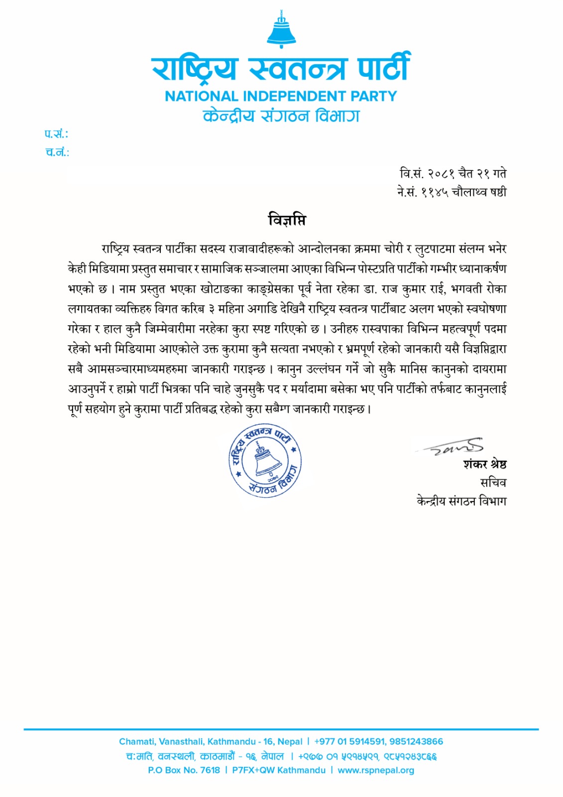 ‘खोटाङका काङ्ग्रेसका पूर्वनेता रहेका डा.राजकुमार राई, भगवती रोकालगायतका व्यक्तिहरु विगत करिब तीन महिना अगाडि देखिनै राष्ट्रिय स्वतन्त्र पार्टीबाट अलग भएको स्वघोषणा गरेका र हाल कुनै जिम्मेवारीमा नरहेका कुरा स्पष्ट गरिएको छ । उनीहरु रास्वपाका विभिन्न महत्वपूर्ण पदमा रहेको भनी मिडियामा आएकाले उक्त कुरामा कुनै सत्यता नभएको र भ्रमपूर्ण रहेको जानकारी यसै विज्ञप्तिद्वारा सबै आमसञ्चारमाध्यमहरुमा जानकारी गराइन्छ,’विज्ञप्तिमा भनिएको छ ।