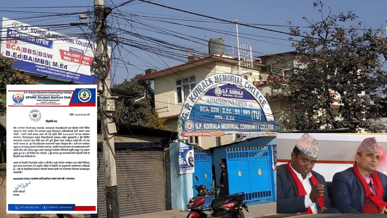 कलेजमा बिएएसडब्लु संकायमा अध्ययनरत विद्यार्थीहरूको हक हितका लागि सगठित संस्था जीपी केएमसी स्टुडेन्ट वेलफेयर क्लवले चार दिनको समयावधि सहित आइतबार विज्ञप्ति निकालेर आपत्ति प्रकट गरेका हुन् ।