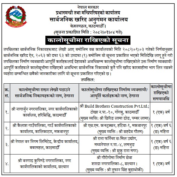 कार्यालयले आज सूचना जारी गर्दै विभिन्न निकायबाट कालो सूचीमा राख्नको लागि लेखि पठाएअनुसार चारवटा निर्माण कम्पनीलाई काली सूचीमा राखिएको जनाएको हो ।