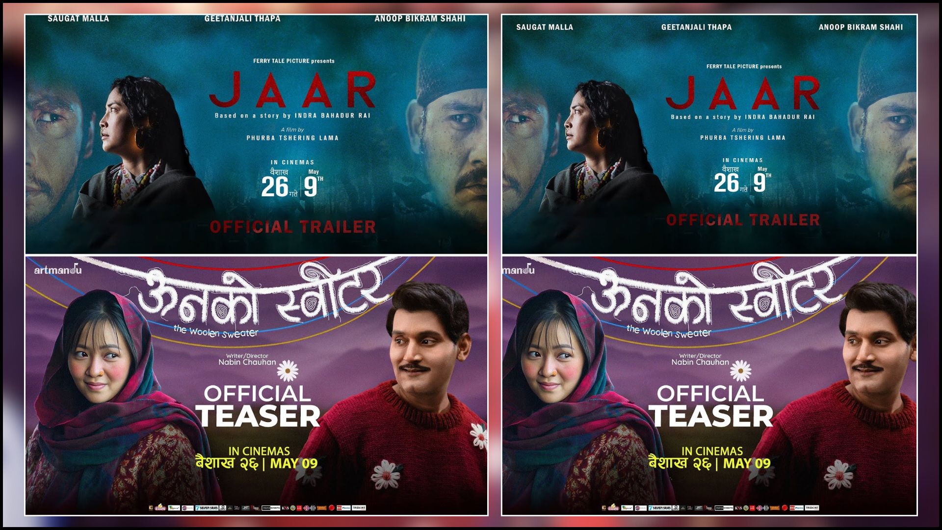 काठमाडौं । फ्राइडे रिलिजअन्तर्गत आज एकै दिन दुईवटा नेपाली चलचित्र प्रदर्शन भएका छन् । फुर्वा छिरिङ लामाको ‘जार’ र नवीन चौहान निर्देशित ‘ऊनको स्वीटर’ प्रदर्शनमा आएका हुन् ।