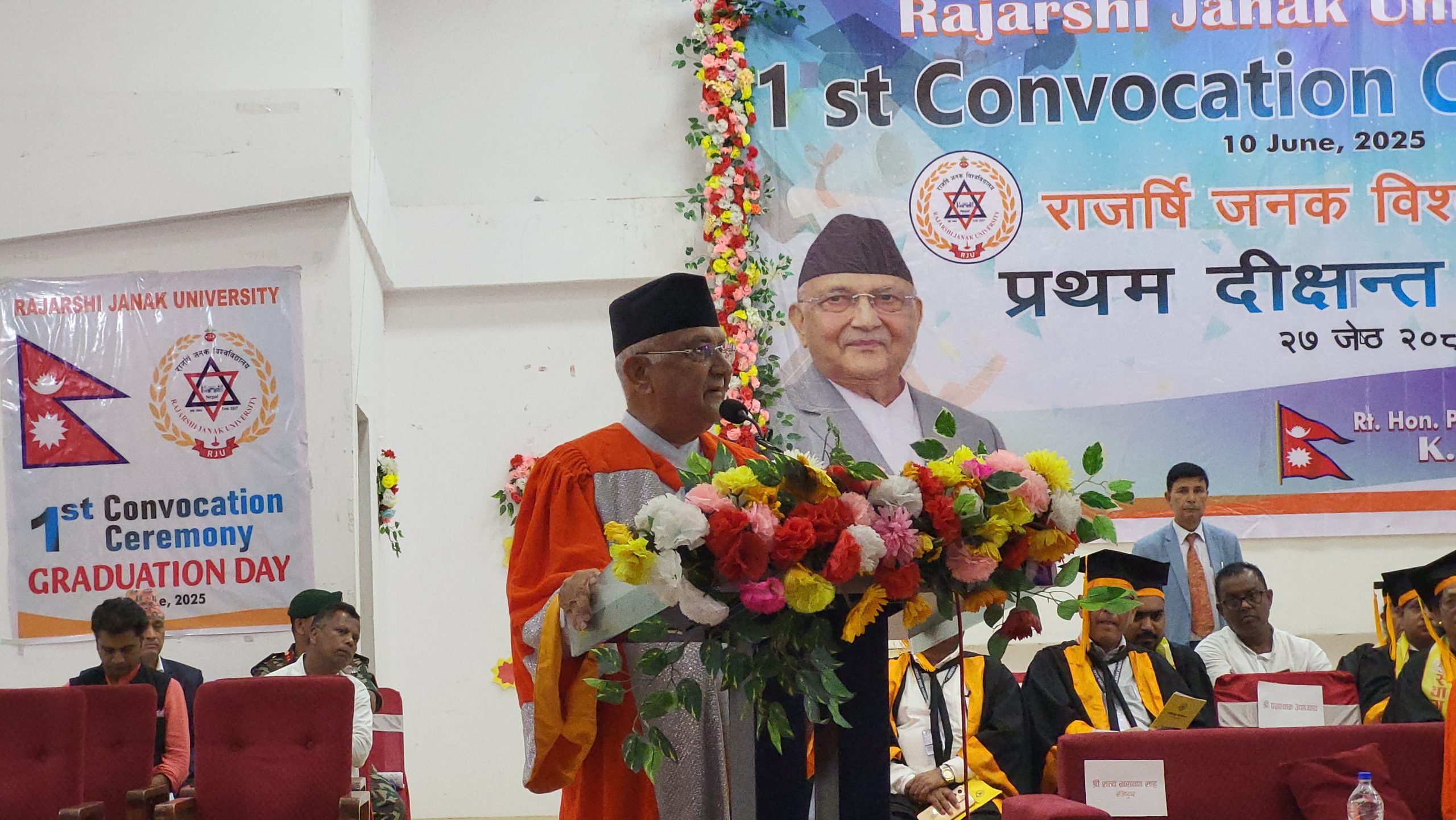 त्यस्तै कार्यक्रममा बोल्दै प्रधानमन्त्री केपी शर्मा ओलीले जनकपुरधाममा राजर्षि जनक विश्वविद्यालयको पहिलो दिक्षान्त समारोहमा शासकीय कुव्यवस्थालाई दोषी ठहर गर्दै विश्वविद्यालयको स्थापना र विद्यार्थीहरूको दिक्षान्तमा खुशी व्यक्त गरे ।