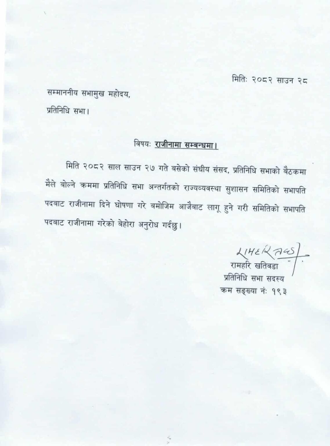 ‘मिति २०८२ साल साउन २७ गते बसेको संघीय संसद, प्रतिनिधिसभाको बैठकमा मैले बोल्ने क्रममा प्रतिनिधिसभा अन्तर्गतको राज्यव्यवस्था सुशासन समितिको सभापति पदबाट राजीनामा दिने घोषणा गरे बमोजिम आजैबाट लागु हुने गरी समितिको सभापति पदबाट राजीनामा गरेको बेहोरा अनुरोध गर्दछु’ खतिवडाको राजीनामा पत्रमा उल्लेख छ ।