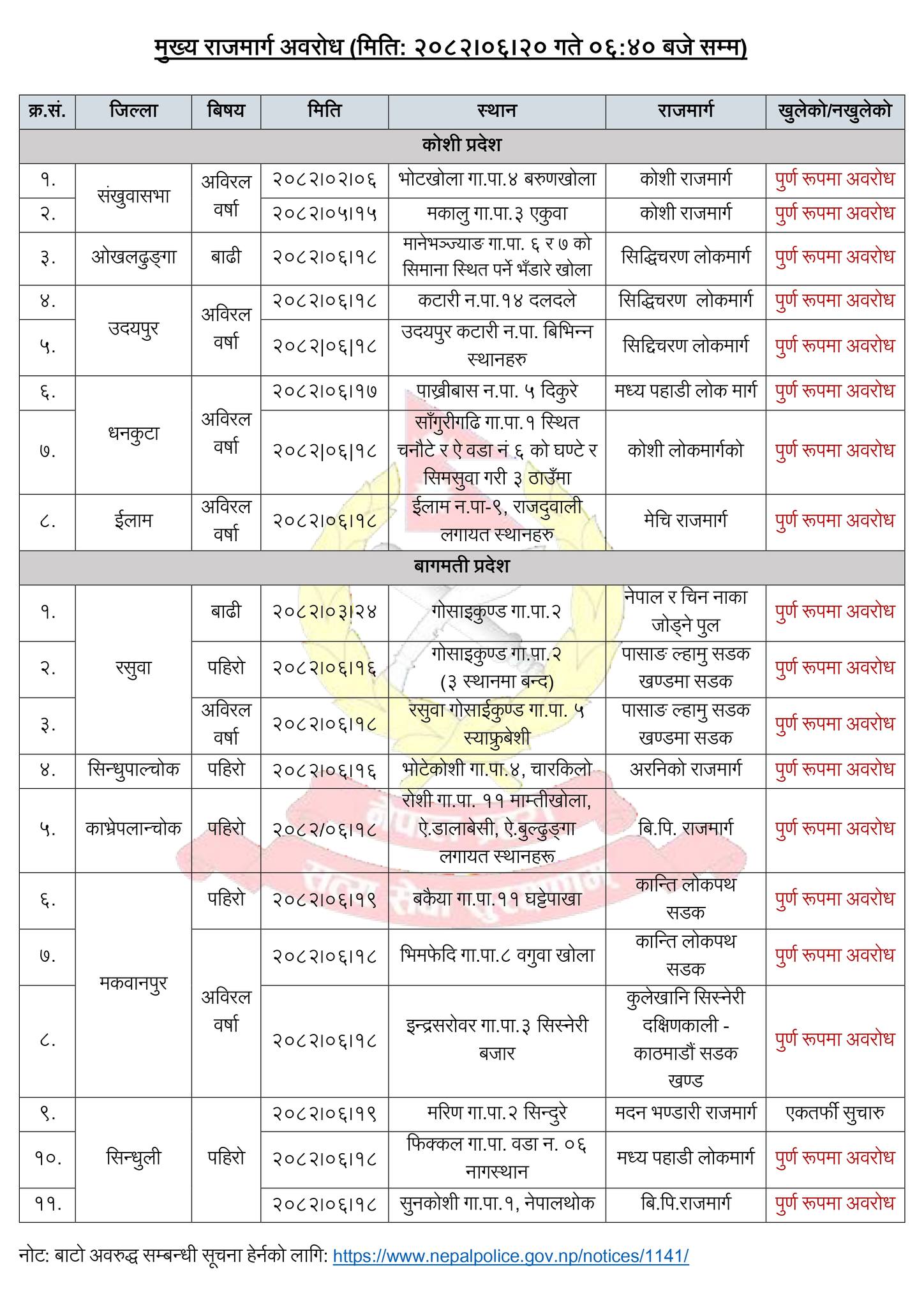 नेपाल प्रहरीले जारी गरेको सडक अवरुद्धको विस्तृत जानकारी: