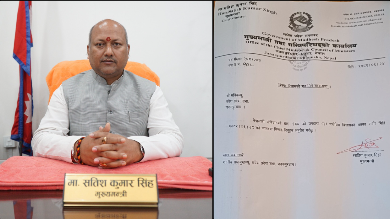 मुख्यमन्त्री सिंहले आज मधेश प्रदेश सभालाई पत्र लेखेर यहि असोज २८ गते विश्वासको मत लिने व्यवस्था मिलाई दिन आग्रह गरेका छन् ।