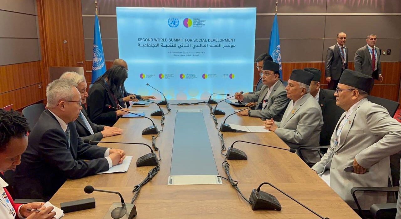 कतारका अमिर शेख तमिम बिन हमद अल थानीको निमन्त्रणामा नेपाली प्रतिनिधिमण्डलको नेतृत्व गर्दै कतारको राजधानी दोहामा मङ्गलबारदेखि शुरु भएको ‘सामाजिक विकासका लागि दोस्रो विश्व शिखर सम्मेलन’मा सहभागी हुन आएका राष्ट्रपति पौडेल र  संयुक्त राष्ट्र संघका महासचिव गुटेरेसबीच आज शीष्टाचार भेटवार्ता भएको हो ।