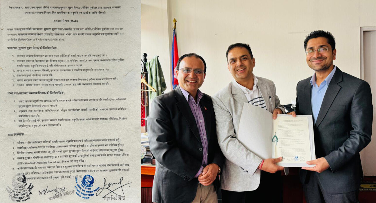 बनेपा काभ्रपेलाञ्चोक, २१ कात्तिकः सरकारले सवारी चालक अनुमतिपत्र लाइसेन्स आफ्नै मुद्रण मेसिनबाट छाप्न सुरु गरेको छ । सञ्चार तथा सूचना प्रविधि मन्त्रालय अन्तर्गतको सुरक्षण मुद्रण केन्द्रले आजदेखि लाइसेन्स छाप्न सुरु गरेको हो ।