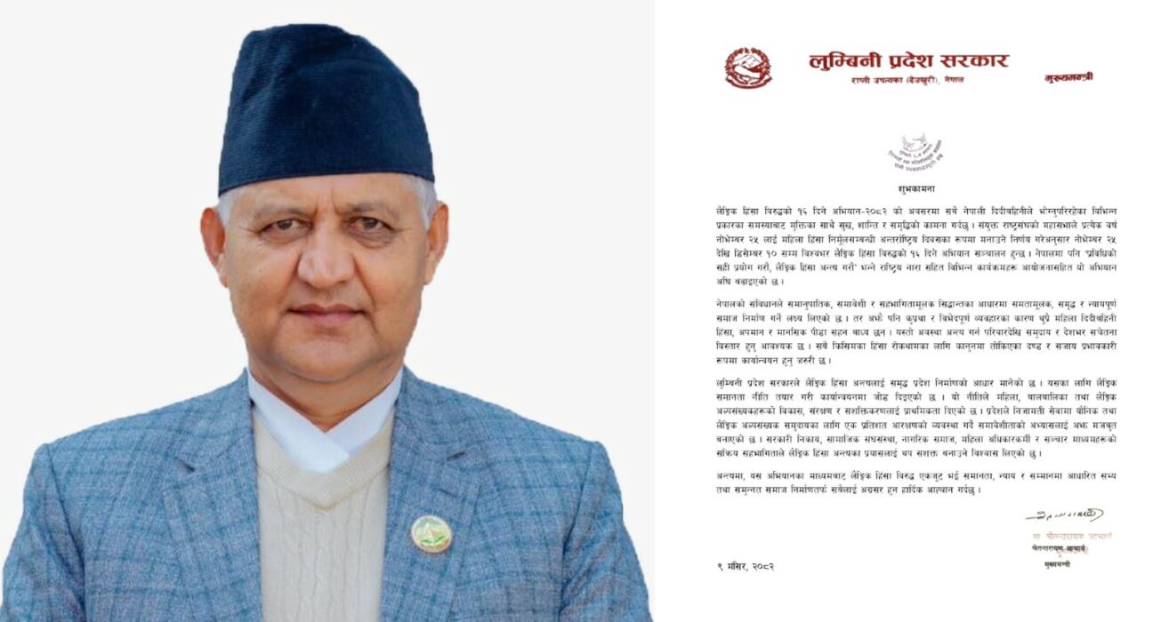 लैङ्गिक हिंसा विरुद्धको १६ दिने अभियान–२०८२ का अवसरमा आज शुभकामना सन्देश जारी गर्दै मुख्यमन्त्री आचार्यले नेपालमा अझै पनि कुप्रथा, विभेदपूर्ण सोच र सामाजिक बन्धनका कारण लैङ्गिक हिंसा सहन बाध्य रहेको भन्दै यस्तो समस्या अन्त्य गर्न परिवारदेखि समुदाय र सरकारी संयन्त्रसम्मको सक्रिय भूमिका आवश्यक रहेकामा जोड दिएका छन् । संविधानले समतामूलक, समावेशी र सहभागितामूलक समाज निर्माण गर्ने लक्ष्य लिएको उल्लेख गर्दै उहाँले लैङ्गिक हिंसा अन्त्यका लागि कानुनमा तोकिएका प्रावधानको प्रभावकारी कार्यान्वयन गर्नुपर्ने, हिंसा प्रभावितको उपचार, संरक्षण तथा पुनस्र्थापनाका उपाय थप प्रभावकारी बनाउनुपर्ने आवश्यक रहेको बताए ।