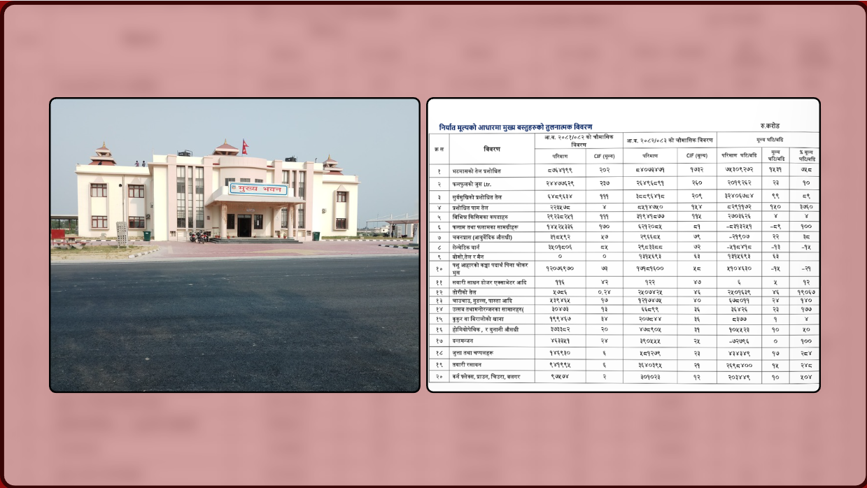 वीरगन्ज नाकाबाट गत आवको पहिलो चौमासिकमा २४ लाख रूपैयाको ५ हजार ७ सय ८३ लिटर तेल निर्यात भएकोमा चालु आवको सोही अवधिमा ४३ करोड रूपैंयाँको २५ लाख ७ हजार ४ सय २५ लिटर तोरीको तेल निर्यात भएको उनले बताए ।