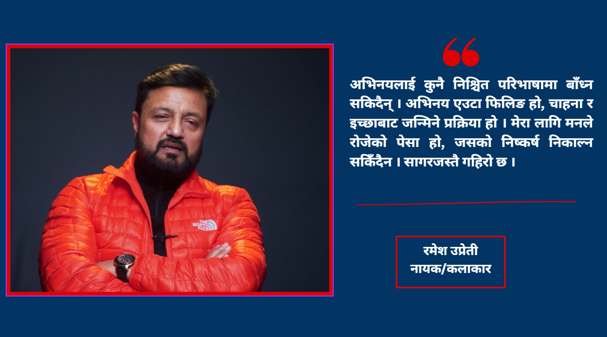उप्रेतीले अभिनयलाई कुनै निश्चित परिभाषामा बाँध्न नसकिने अनुभवको रूपमा व्याख्या गरे । ‘अभिनय एउटा फिलिङ हो, चाहना र इच्छाबाट जन्मिने प्रक्रिया हो,’ उनले भने, ‘यो मनले रोजेको पेसा हो, जसको निष्कर्ष निकाल्न सकिँदैन । सागरजस्तै गहिरो छ ।’