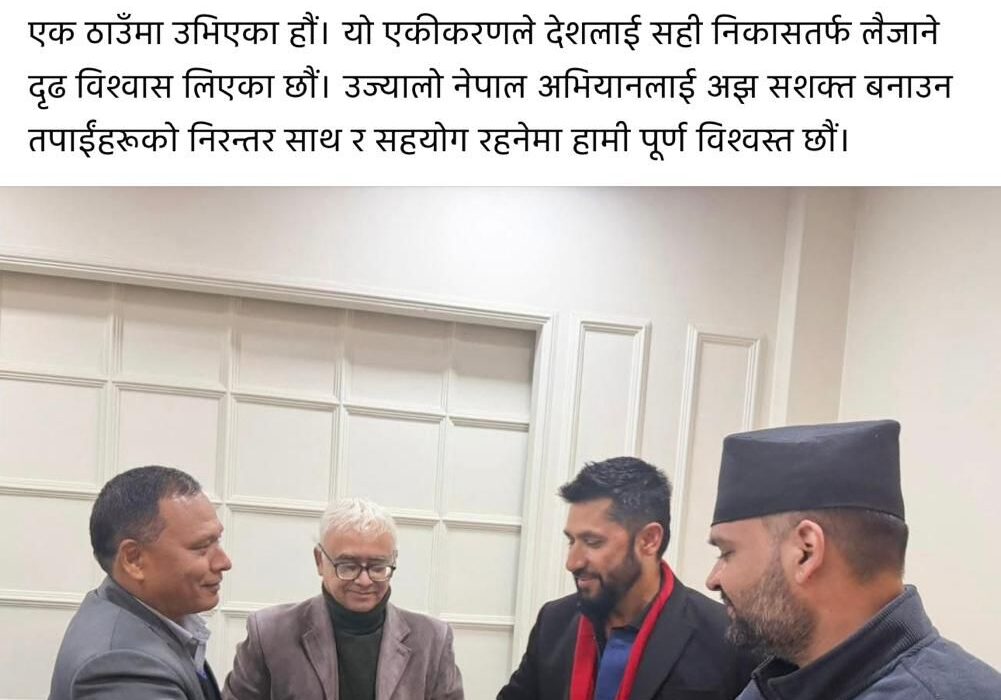 सामाजिक सञ्जालमार्फत मंगलबार मात्रै उनले पद, स्वार्थ र व्यक्तिगत लाभभन्दा उज्यालो भविष्यको मार्गतर्फ एक ठाउँमा उभिएका बताएका हुन् ।