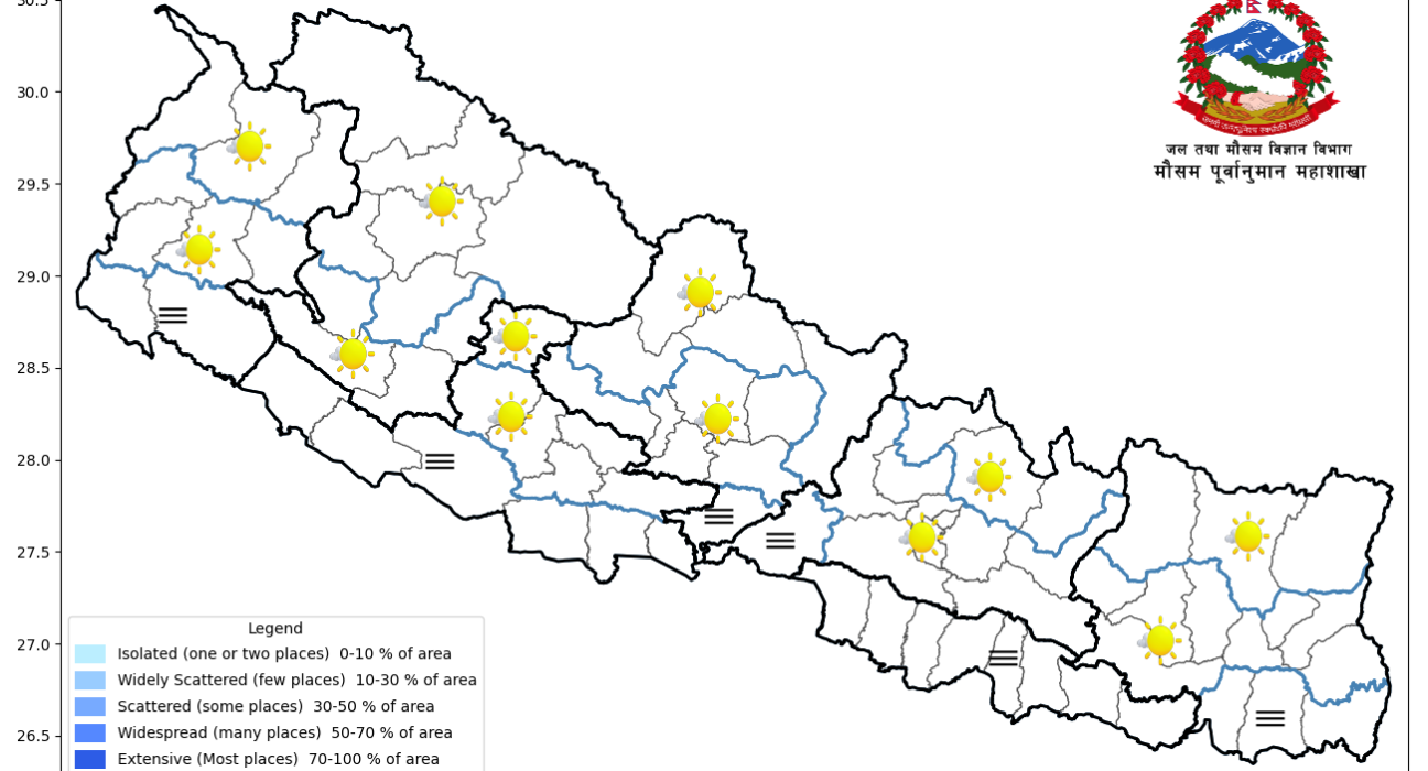 त्यसैगरी, आज राति तराईका केही स्थानमा कुहिरो लाग्ने छ भने पहाडी तथा हिमाली भागमा मौसम सफा रहनेछ ।