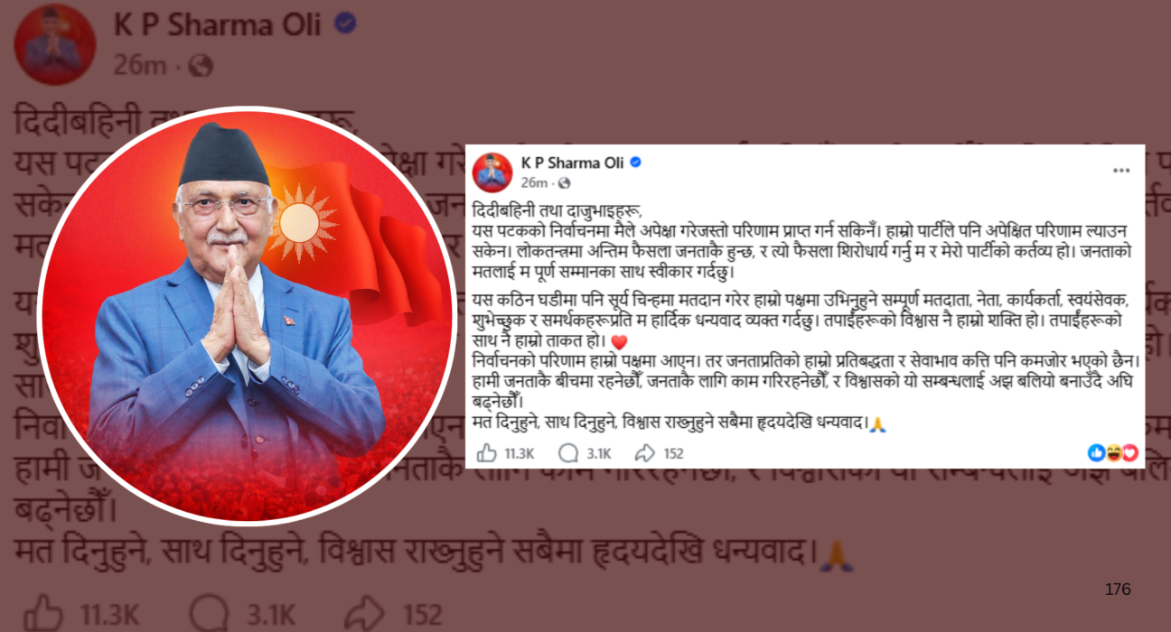 उनले निर्वाचन परिणाम पक्षमा नआए पनि जनताप्रतिको प्रतिबद्धता र सेवाभाव कमजोर नहुने स्पष्ट पारेका छन् । आगामी दिनमा पनि जनताकै बीचमा रहेर जनताकै हितमा काम गर्दै विश्वासको सम्बन्धलाई अझ बलियो बनाउँदै अघि बढ्ने प्रतिबद्धता ओलीले व्यक्त गरेका छन् ।
