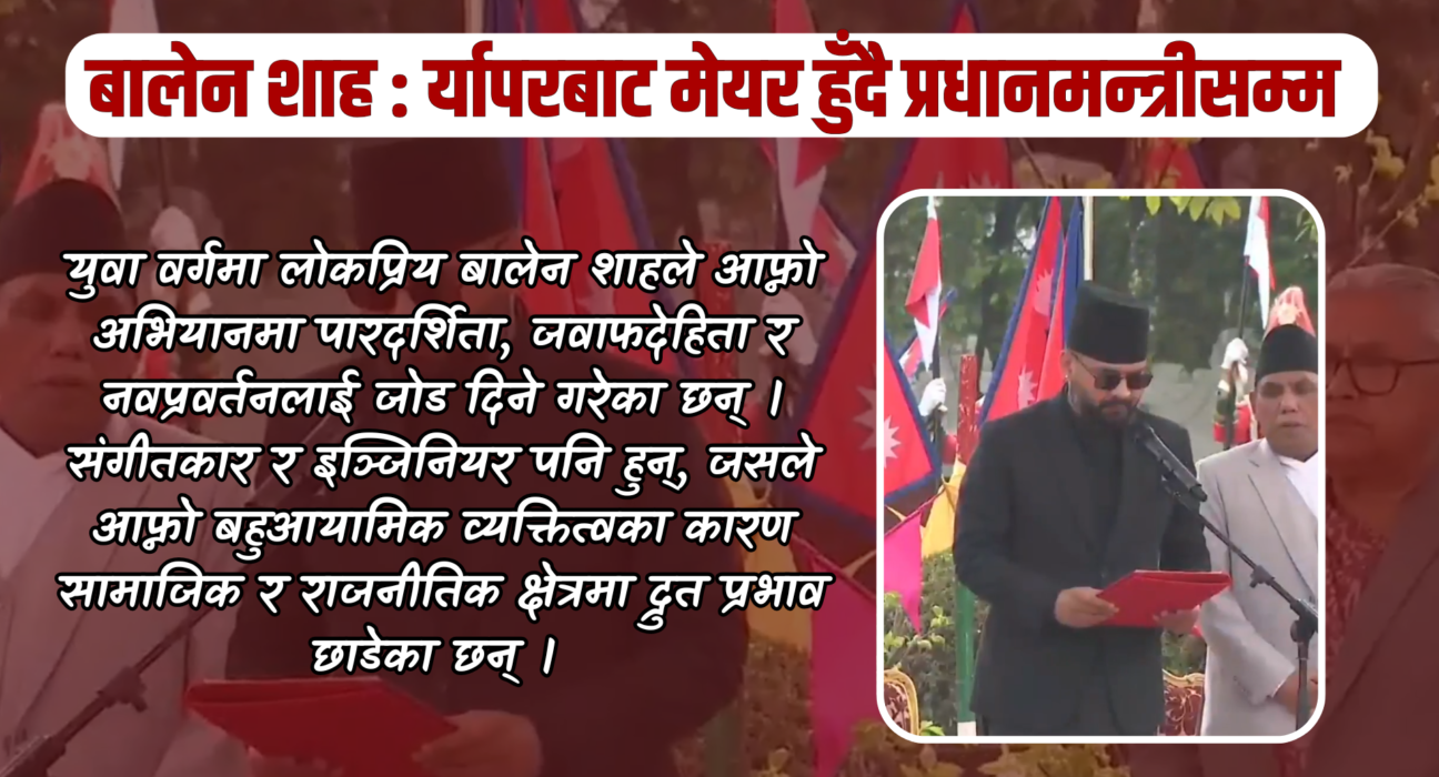 काठमाडौं । र्यापर, इञ्जिनियर र समाजसेवी बालेन शाह(बालेन्द्र) नेपालको ४३औं प्रधानमन्त्री बनेका छन् । उनका लागि यो यात्रा केवल राजनीतिक पदमात्रै होइन, आन्दोलन, संघर्ष र परिवर्तनको कथापनि हो ।