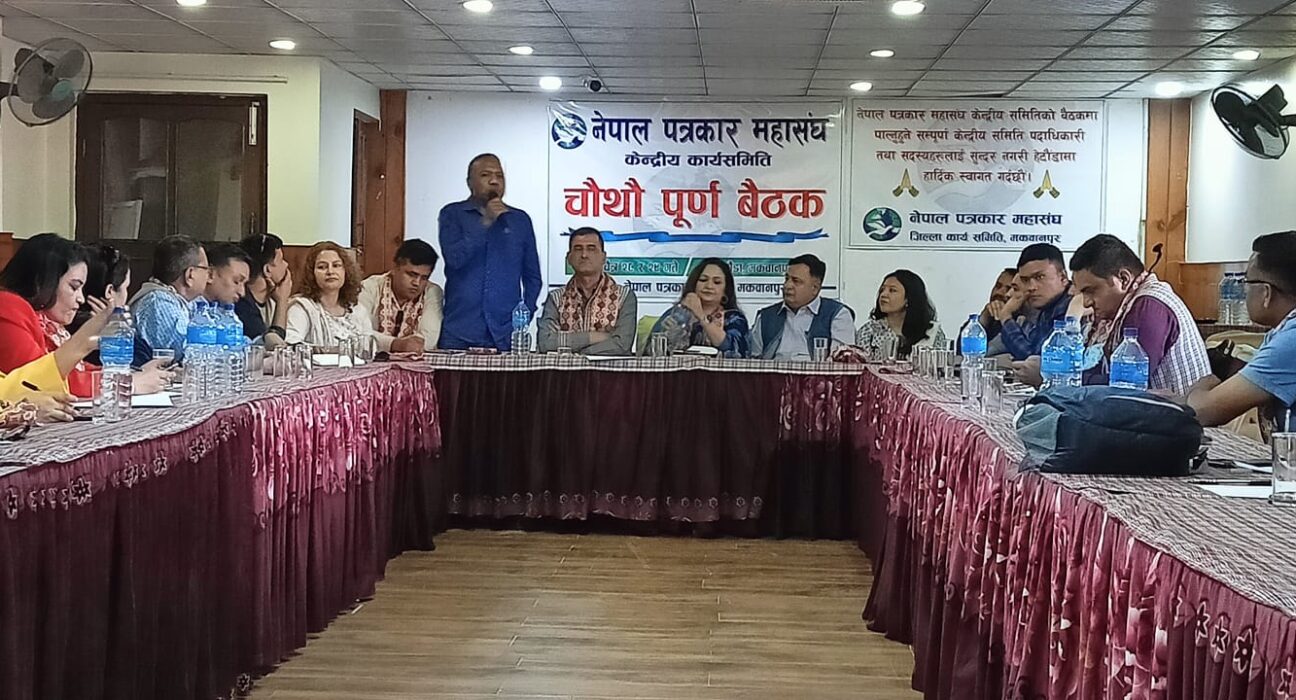 नेपाल पत्रकार महासंघको आइतबार हेटौँडामा सम्पन्न चौथो पूर्ण बैठकले प्रेस स्वतन्त्रता र अभिव्यक्ति स्वतन्त्रताको मुद्दामा महासंघ एक भएर अघि बढ्ने निर्णय गरेको महासंघकी अध्यक्ष निर्मला शर्माले जानकारी दिइन् ।